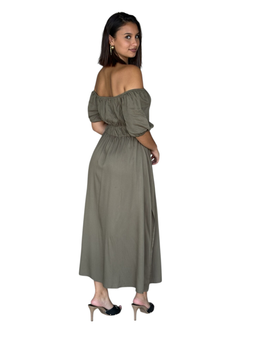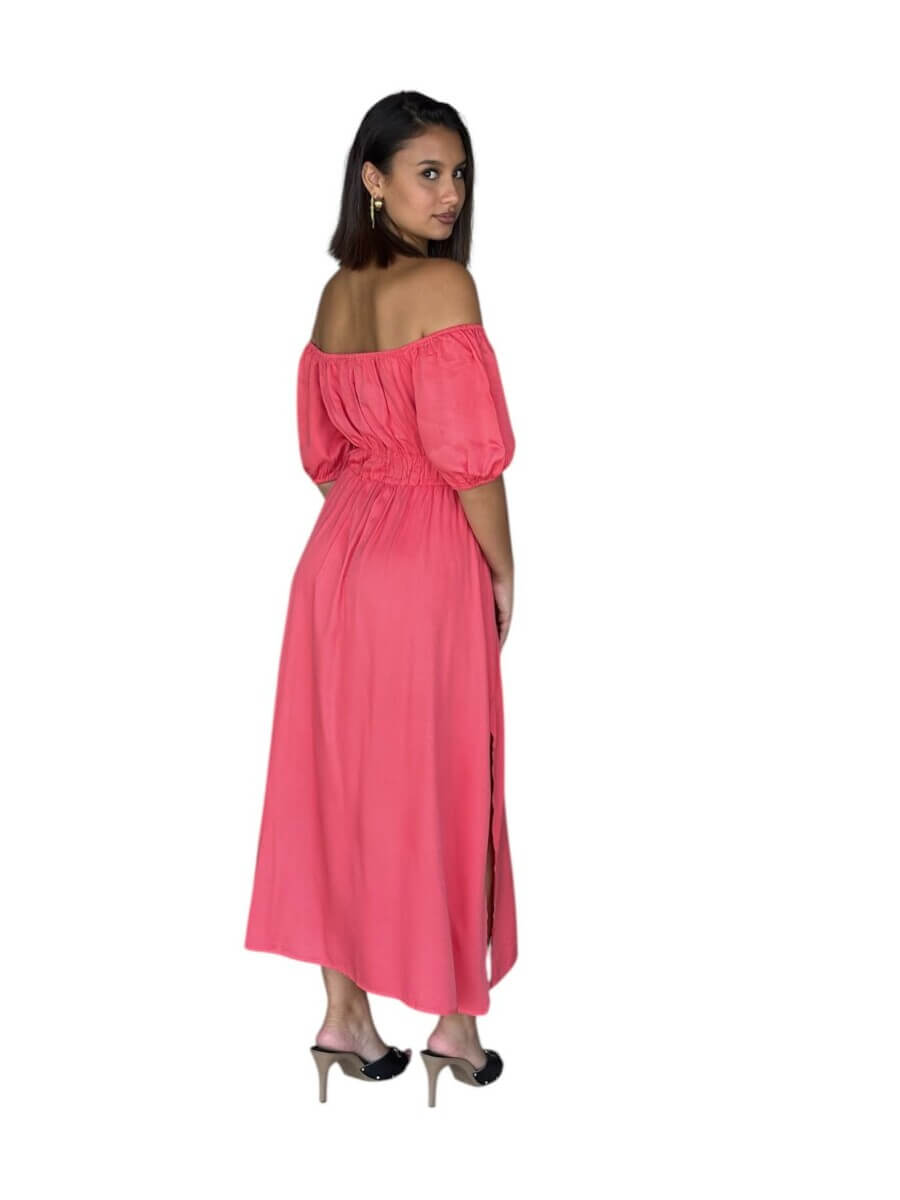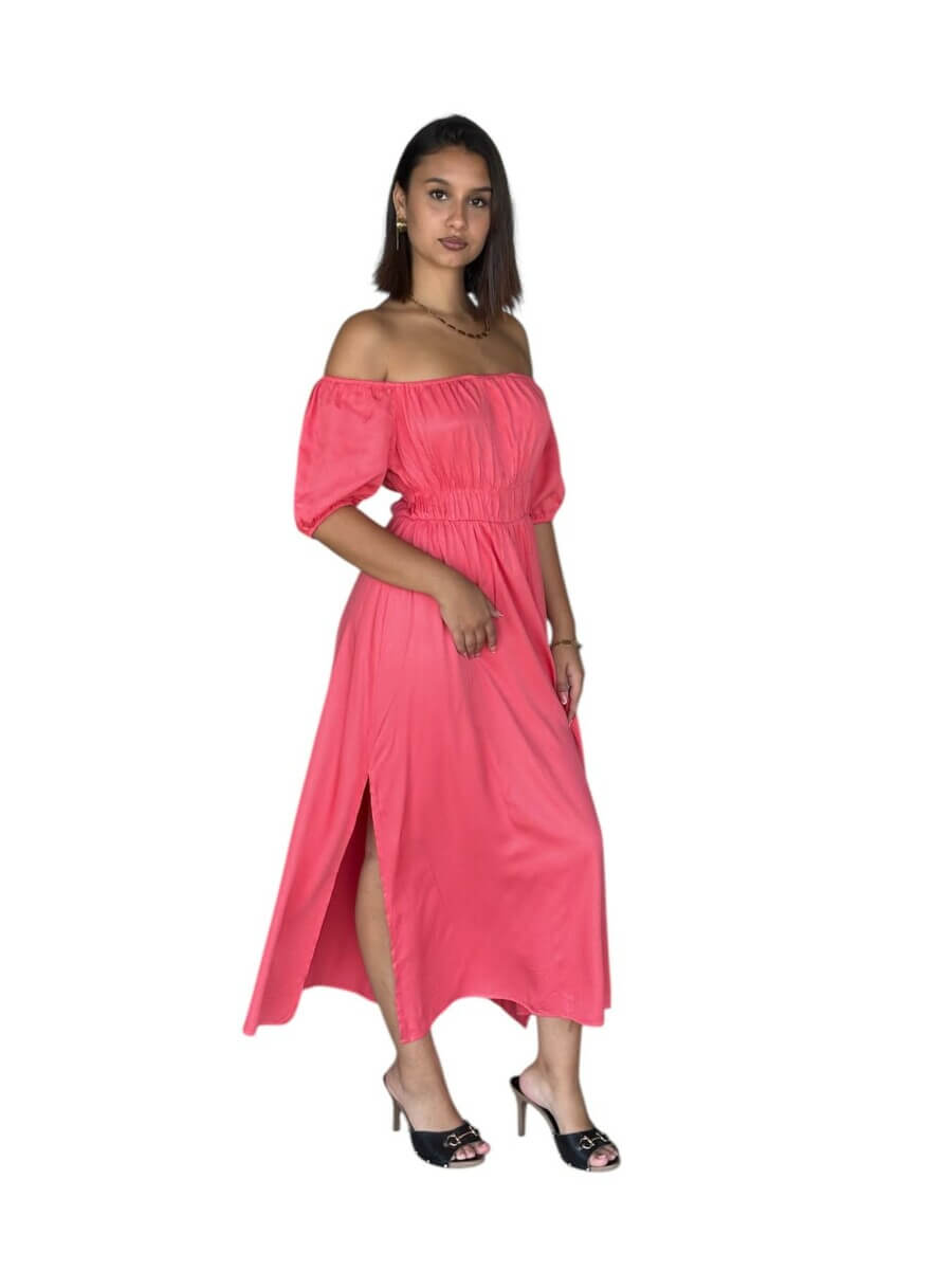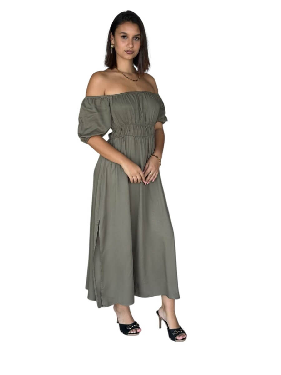 Son encolure bardot élastiquée permet de dégager les épaules tout en assurant un maintien stable. Les manches courtes ballon, légèrement bouffantes, apportent du volume et structurent le haut de la silhouette avec équilibre.